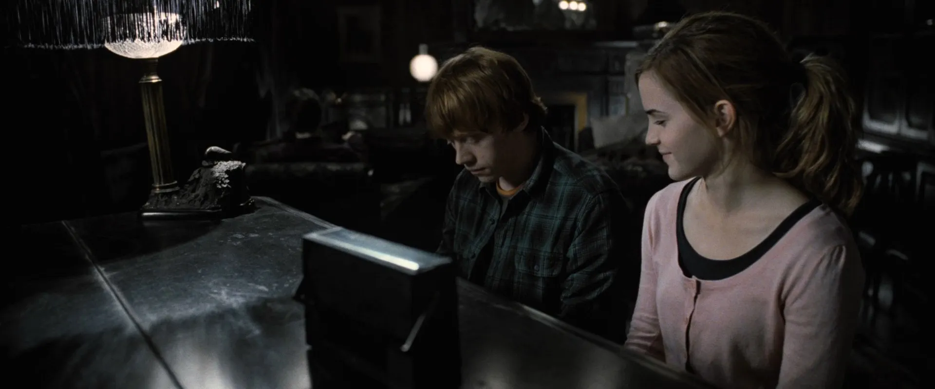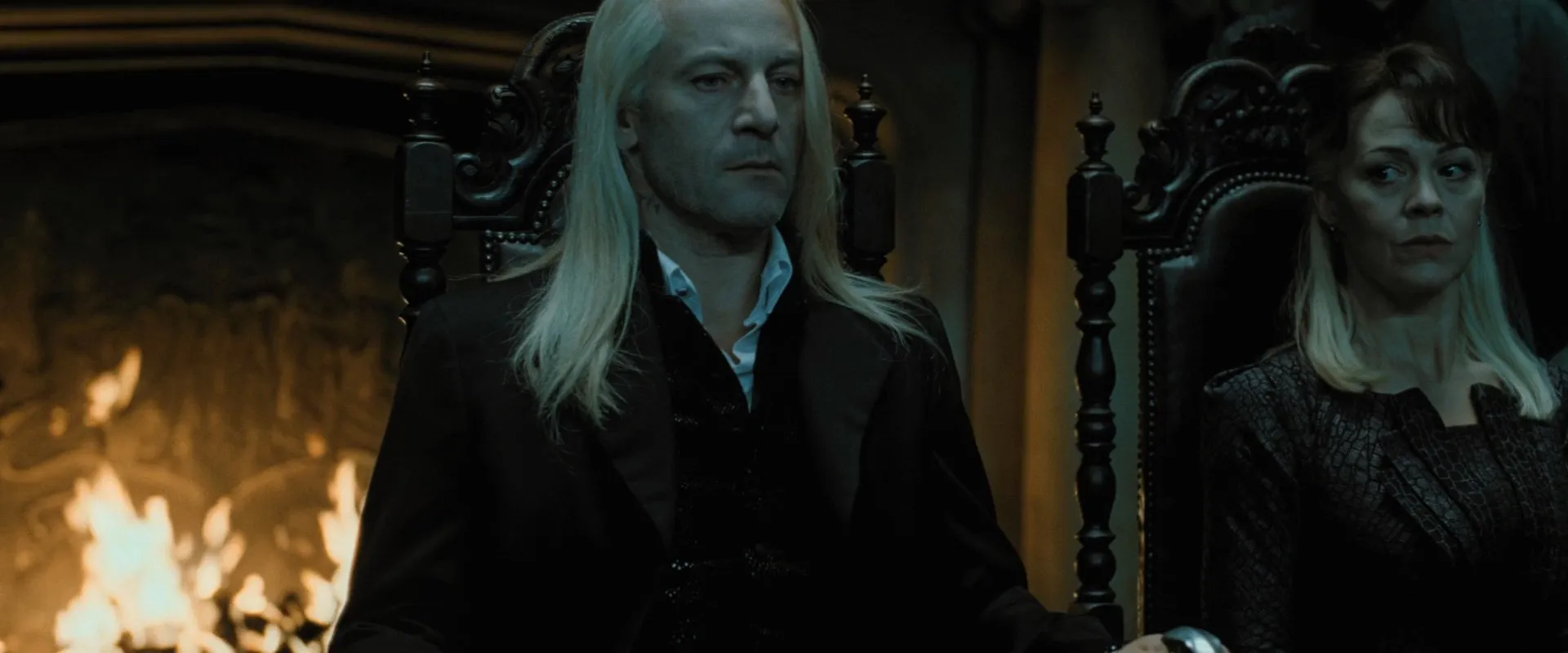 Starring: Daniel Radcliffe as Harry Potter, Rupert Grint as Ron Weasley, Emma Watson as Hermione Granger, Helena Bonham Carter as Bellatrix Lestrange, Robbie Coltrane as Rubeus Hagrid, Ralph Fiennes as Lord Voldemort, Michael Gambon as Albus Dumbledore, Bill Nighy as Rufus Scrimgeour, Brendan Gleeson as Alastor "Mad-Eye" Moody, Richard Griffiths as Vernon Dursley, John Hurt as Ollivander, Rhys Ifans as Xenophilius Lovegood, Jason Isaacs as Lucius Malfoy, Alan Rickman as Severus Snape, Fiona Shaw as Petunia Dursley, Timothy Spall as Peter Pettigrew, Imelda Staunton as Dolores Umbridge, David Thewlis as Remus Lupin, Warwick Davis as Griphook, Tom Felton as Draco Malfoy, Toby Jones as Dobby (voice), Dave Legeno as Fenrir Greyback, Simon McBurney as Kreacher (voice), Helen McCrory as Narcissa Malfoy, Nick Moran as Scabior, Peter Mullan as Corban Yaxley, David O'Hara as Albert Runcorn, Clémence Poésy as Fleur Delacour, Natalia Tena as Nymphadora Tonks, Julie Walters as Molly Weasley, Mark Williams as Arthur Weasley, Bonnie Wright as Ginny Weasley, Harry Melling as Dudley Dursley, Ian Kelly as Mr Granger, Michelle Fairley as Mrs Granger, Carolyn Pickles as Charity Burbage, Graham Duff as Death Eater, Guy Henry as Pius Thicknesse, Arben Bajraktaraj as Antonin Dolohov, Rod Hunt as Thorfinn Rowle, Suzie Toase as Alecto Carrow, Ralph Ineson as Amycus Carrow, Adrian Annis as Death Eater, Emil Hostina as Death Eater, Paul Khanna as Death Eater, Richard Strange as Death Eater, Anthony John Crocker as Death Eater, Peter G. Reed as Death Eater, Granville Saxton as Death Eater, Judith Sharp as Death Eater, Ashley McGuire as Death Eater, Penelope McGhie as Death Eater, Bob Yves Van Hellenberg Hubar as Death Eater, Tony Kirwood as Death Eater, David Ryall as Elphias Doge, James Phelps as Fred Weasley, Oliver Phelps as George Weasley, George Harris as Kingsley Shacklebolt, Andy Linden as Mundungus Fletcher, Domhnall Gleeson as Bill Weasley, Frances de la Tour as Olympe Maxime, Evanna Lynch as Luna Lovegood, Matyelok Gibbs as Auntie Muriel, Eva Alexander as Waitress, Matthew Lewis as Neville Longbottom, Jon Campling as Death Eater, Devon Murray as Seamus Finnigan, William Melling as Nigel Wolpert, Simon Grover as Death Eater, Freddie Stroma as Cormac McLaggen, Isabella Laughland as Leanne, Jessie Cave as Lavender Brown, Anna Shaffer as Romilda Vane, Josh Herdman as Gregory Goyle, Amber Evans as Twin Girl 1, Ruby Evans as Twin Girl 2, Katie Leung as Cho Chang, Georgina Leonidas as Katie Bell, Louis Cordice as Blaise Zabini, Scarlett Hefner as Pansy Parkinson, Afshan Azad as Padma Patil, Steffan Rhodri as Reginald Cattermole, Sophie Thompson as Mafalda Hopkirk, Daniel Tuite as Skinny Ministry Wizard, Daisy Haggard as Ministry Lift (voice), George Potts as Balding Wizard, Rose Keegan as Red Haired Witch, Ned Dennehy as Scared Man, Kate Fleetwood as Mary Cattermole, Daniel Hill as Bushy Haired Muttering Wizard, Rade Šerbedžija as Mykew Gregorovitch, Jamie Campbell Bower as Young Grindelwald, Hazel Douglas as Bathilda Bagshot, Adrian Rawlins as James Potter, Geraldine Somerville as Lily Potter, Miranda Richardson as Rita Skeeter, Michael Byrne as Gellert Grindelwald, Samuel Roukin as Snatcher, Toby Regbo as Young Albus Dumbledore (uncredited), Lewis Young as Snatcher (uncredited)